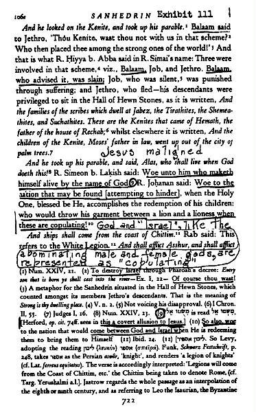 Dilling's assumption that this text refers to Jesus is confirmed by the Sanhedrin General Index entry for "Jesus" (Exhibit 118), where this page -- page 722 of Tractate Sanhedrin, folio 106a -- is listed. Holographically reproduced in her book, this page was taken from the Soncino Press 1936 publication of the Babylonian Talmud. The full context of this exhibit (without marginal notation) can be found in the Text of the TalmudNOTE: